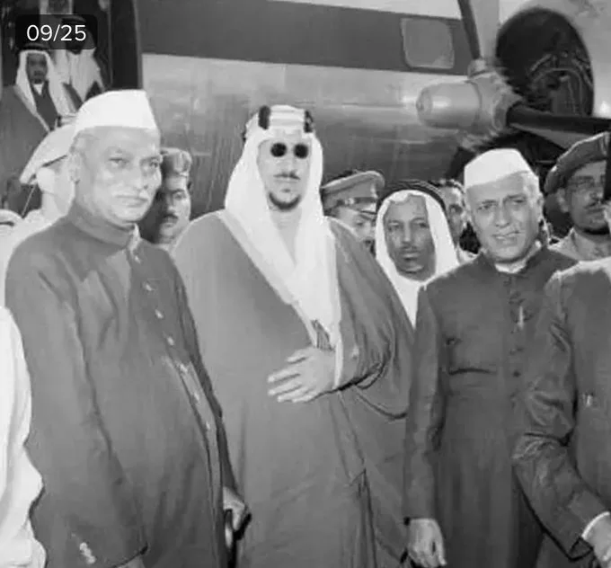 ويظهر في "الصورة" الملك سعود وعلى يمينه الرئيس الهندي "براساد" ورئيس الوزراء جواهر لال نهرو ومترجم الملك سعود يوسف العليان.