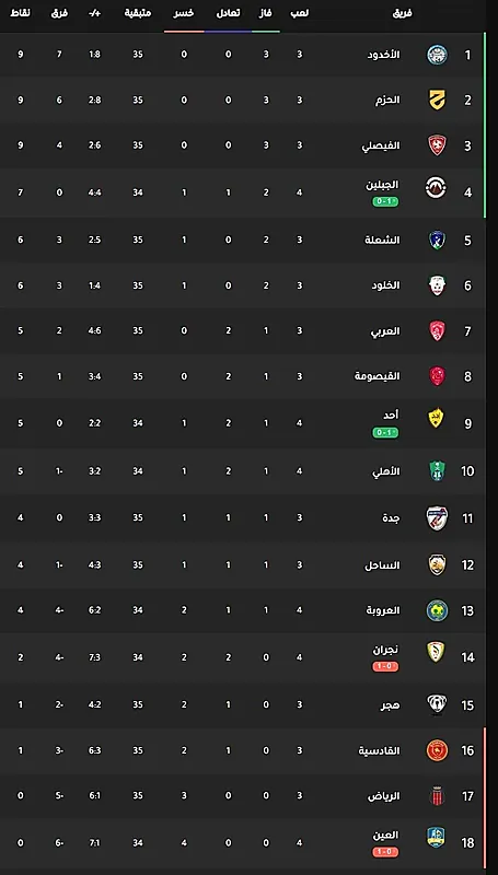 وتتصدر فرق الأخدود، والحزم، والفيصلي، جدول ترتيب دوري يلو الدرجة الأولى السعودي برصيد 9 نقاط لكل منها، من 3 جولات، مقابل 7 نقاط من 4 مباريات للجبلين، و6 نقاط لكل من الشعلة والخلود من 3 مباريات.