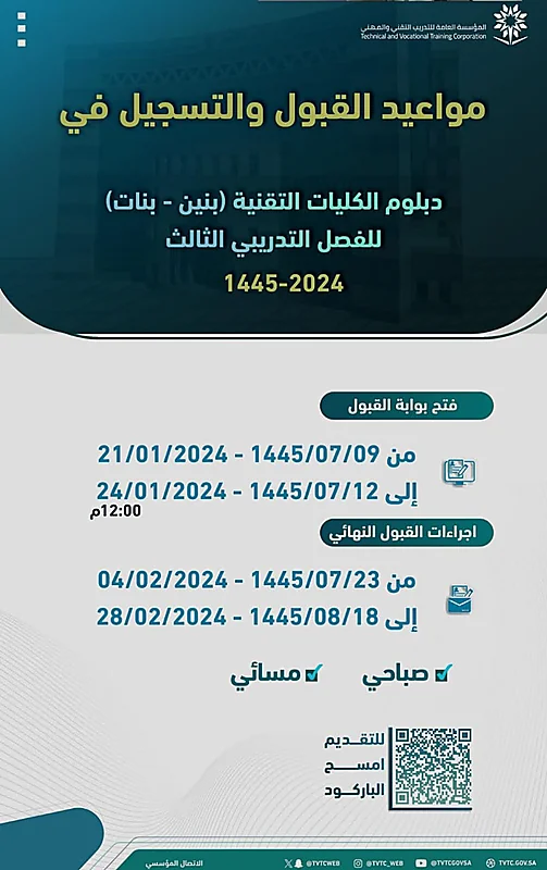أعلنت المؤسسة العامة للتدريب المهني والتقني عن مواعيد القبول والتسجيل للكليات والمعاهد للفصل الدراسي الثالث، على أن تكون جميع الإجراءات إلكترونية، بداية من تقديم الطلب حتى إصدار الرقم التدريبي للمقبولين، وذلك من خلال منصة قبولي.