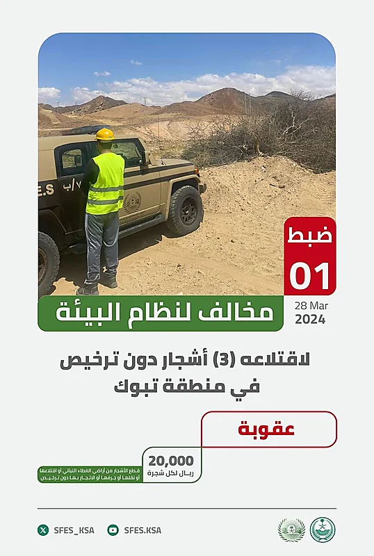 ضبط مخالفًا لنظام البيئة لاقتلاعه الأشجار دون ترخيص بتبوك