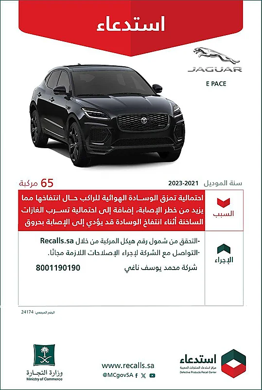أعلنت وزارة التجارة عن استدعاء 65 مركبة من طراز جاكوار “E PACE” التي تم تصنيعها بين عامي 2021 و2023