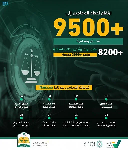ووفرت وزارة العدل من خلال بوابة الخدمات العدلية الإلكترونية "ناجز"  مجموعة من الخدمات الإلكترونية للمحامين والمتدربين، تمكنهم من الحصول عليها دون الحاجة إلى زيارة مقر الوزارة أو الإدارة العامة للمحاماة، وذلك في إطار سعي الوزارة لدعم المحامين والتيسير على المستفيدين وتوفير الجهد والوقت عليهم.