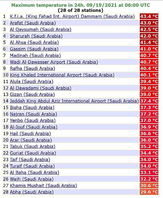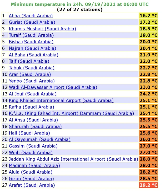 كما كشف عن درجة الحرارة الصغرى المسجلة فجر اليوم 29 محطة في السعودية، ودرجة الحرارة الكبرى ليوم أمس وهي كالتالي: