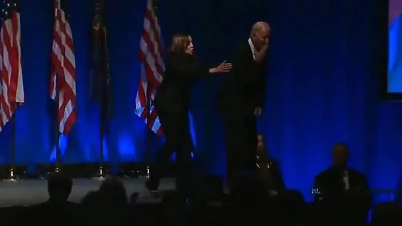 أصيبت كامالا هاريس نائبة الرئيس الأمريكي جو بايدن، بالفزع، بعد محاولة "بايدن" للقفز من فوق خشبة المسرح.