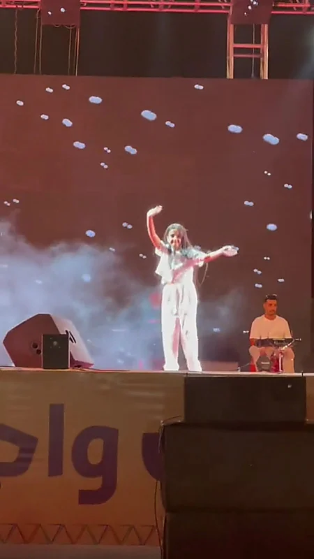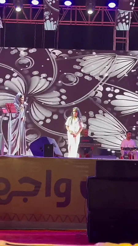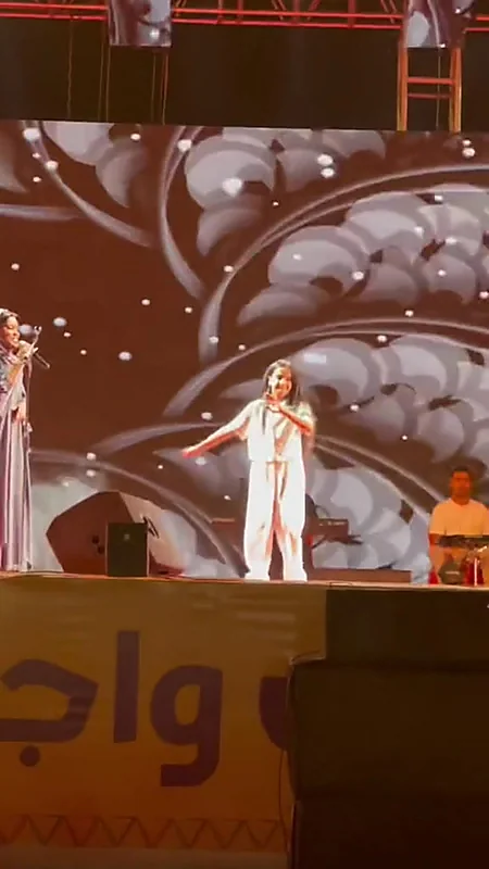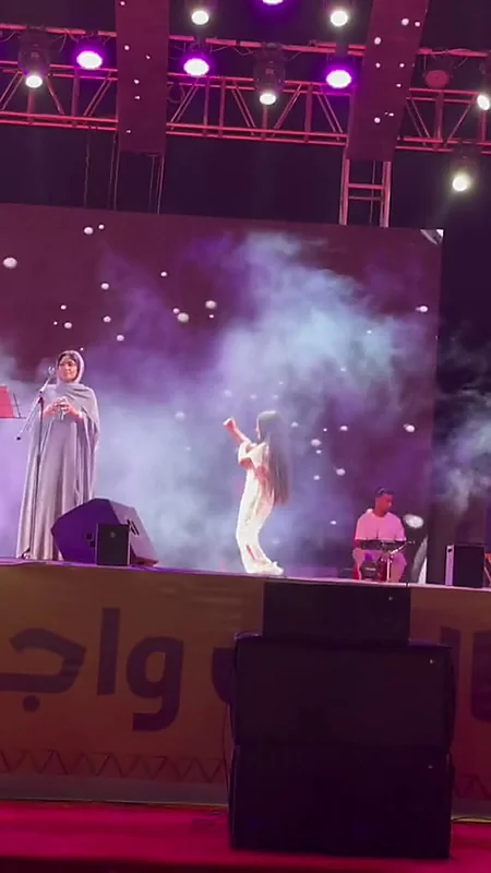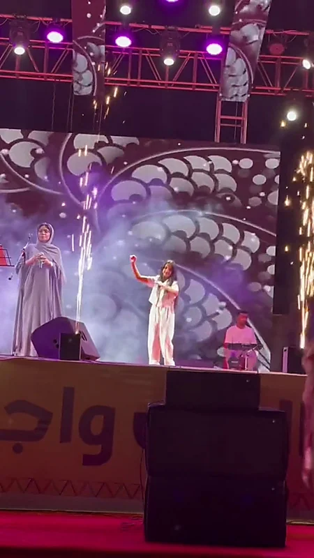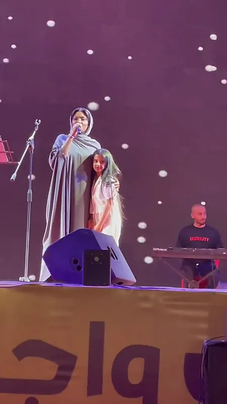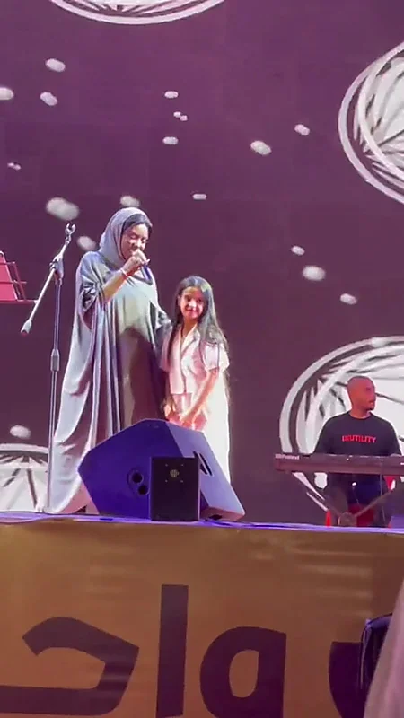 وظهرت الطفلة وهي تقف بجوار رحاب الشمراني على المسرح، فيما أخذت الشمراني تحتضنها وترحب بها وهي تؤدي أغنياتها.