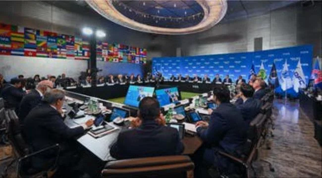 ظهر علم سوريا الجديد خلف جياني إنفانتينو، رئيس الاتحاد الدولي لكرة القدم، أثناء حديثه في كونغرس "فيفا" والإعلان عن الدول المستضيفة لكأسي العالم 2030 و2034.