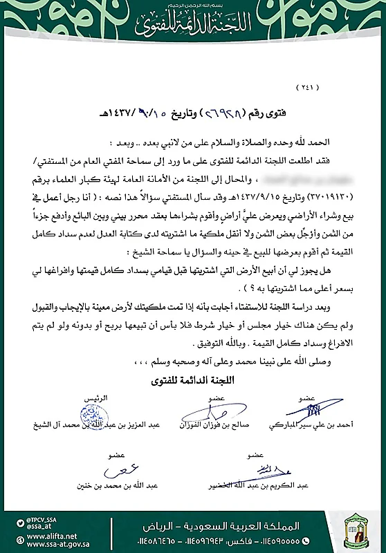 وقالت لجنة الاستفتاء، إنه "إذا تمت ملكية الأرض لشخص ما بالإيجاب والقبول ولم يكن هناك خيار مجلس أو خيار شرط فلا بأس أن يبيعها بربح أو بدونه ولو لم يتم الإفراغ وسداد كامل القيمة".